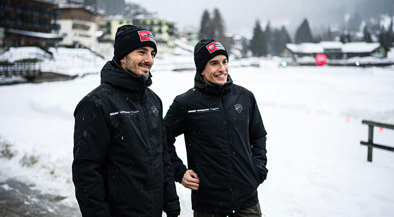 On Tuesday 21 January, Bagnaia, Márquez and the entire Ducati and Ducati Corse management enjoyed a wonderful day on skis, challenging each other in an exciting downhill race. At lunchtime the first “Face to Face” interview took place in a dreamlike natural setting, at an altitude of 1,750 MASL in the snow of the Skiarea Madonna di Campiglio Dolomiti di Brenta. The Ducati Lenovo Team riders answered several questions about the season ahead and their future as teammates. The video of the interview is online on the Ducati YouTube channel, at this link.