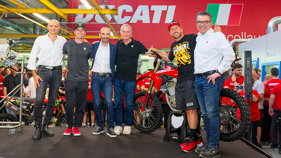 Borgo Panigale, Bologna, 15 May 2025 – Production of the new Desmo450 MX, the first Ducati motocross bike in history, is underway at the Borgo Panigale factory. In the aftermath of the second world podium conquered by Jeremy Seewer in the French Grand Prix, the first Desmo450 MX came off the production line. The celebration of the event was attended by Tony Cairoli, who contributed his invaluable experience to the development of the bike, and Alessandro Lupino, the rider who took the first victory and the national title with it on its debut.