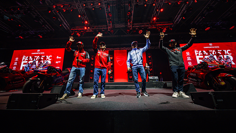 Finally, the highlight of the show arrived with the “Fantastic Four” Ducati riders, dominators of the MotoGP World Championship with 19 wins out of 20 total races, which ignited the enthusiasm of the crowd. The reigning World Champion Jorge Martín, Italian idol Francesco “Pecco” Bagnaia with Marc Márquez and Enea Bastianini threw themselves into the mix, exchanging questions and points of view with each other, and receiving the warm tribute of the public for a season in which they took the Desmosedici GP to an unimaginable level.