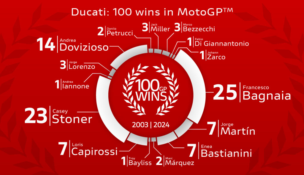 Luigi Dall’Igna (General Manager of Ducati Corse): “Only four years have passed since we celebrated the first historic milestone of 50 victories in MotoGP and in such a short time, we have managed to add up the same number of successes and reach 100. Before us, only two other manufacturers had achieved this and we are the first Europeans to do so. It is certainly an important result, which fills us with immense pride. We owe all this to 15 fantastic riders, who have written important pages of history with us over the years. Today, we also conquer our sixth manufacturers’ title in MotoGP, the fifth consecutive. In addition to the riders and teams, this is the victory of all the men and women of Ducati Corse, many of whom are involved behind the scenes, who with their tireless work, passion and dedication have allowed us to grow and become what we are. So, a heartfelt thank you to all of them and a special thank you also to all our fans, the Ducatisti, who with their support push us every day to reach ever greater goals.”