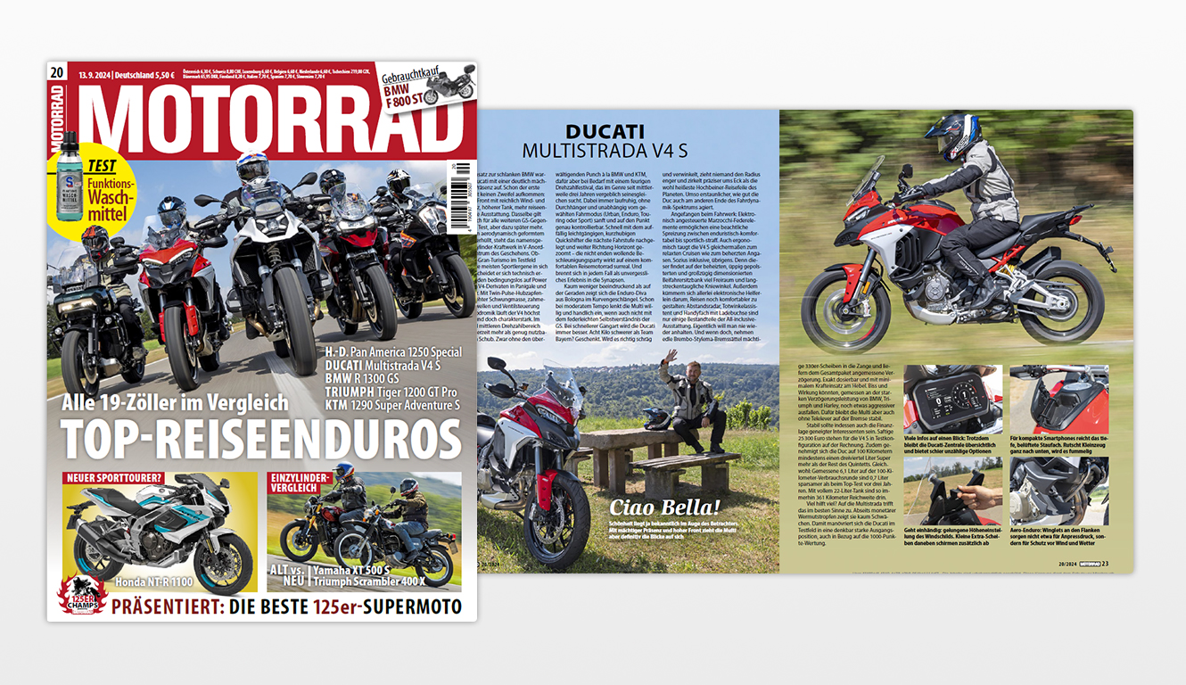 In the Motorrad Issue 20/2024, the Ducati Multistrada V4 S won the comparative test against the best representatives of the maxi-adventure segment – namely, the BMW R 1300 GS, the KTM 1290 SuperAdventure S, the Harley-Davidson Pan America 1250 Special and the Triumph Tiger 1200 GT Pro.
