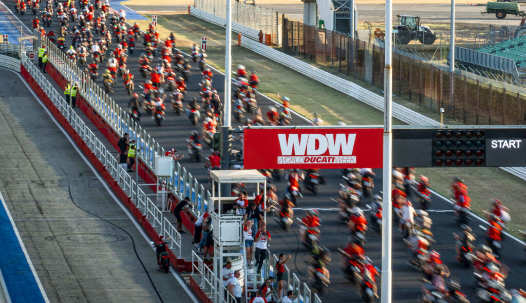 Thousands of Ducati motorcycles gathered in the record-breaking parade of World Ducati Week 2024: a kilometre-long snake that painted the Riviera Romagnola Red in an impressive tribute to the Motor Valley. As per tradition, this was the most symbolic moment of the Friday of WDW2024, an edition that has already given great emotions to the many Ducatisti flocking to the Misano World Circuit since the early hours of the morning of the opening day. The enthusiasm and passion for the Ducati brand pervaded the atmosphere in a unique experience for all participants.
