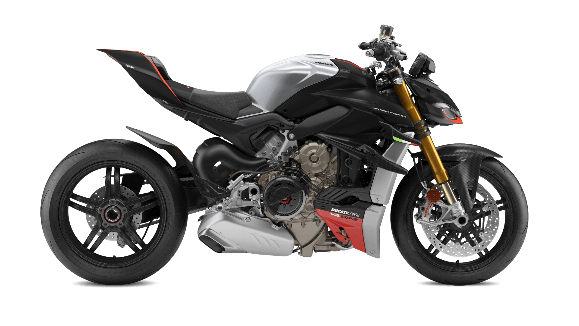 The saddle is specific for the material used and is customized with the “V4 SP2” logo, while the carbon wings are embellished with the Italian flag which also appears on the official Panigale V4 R SBK.